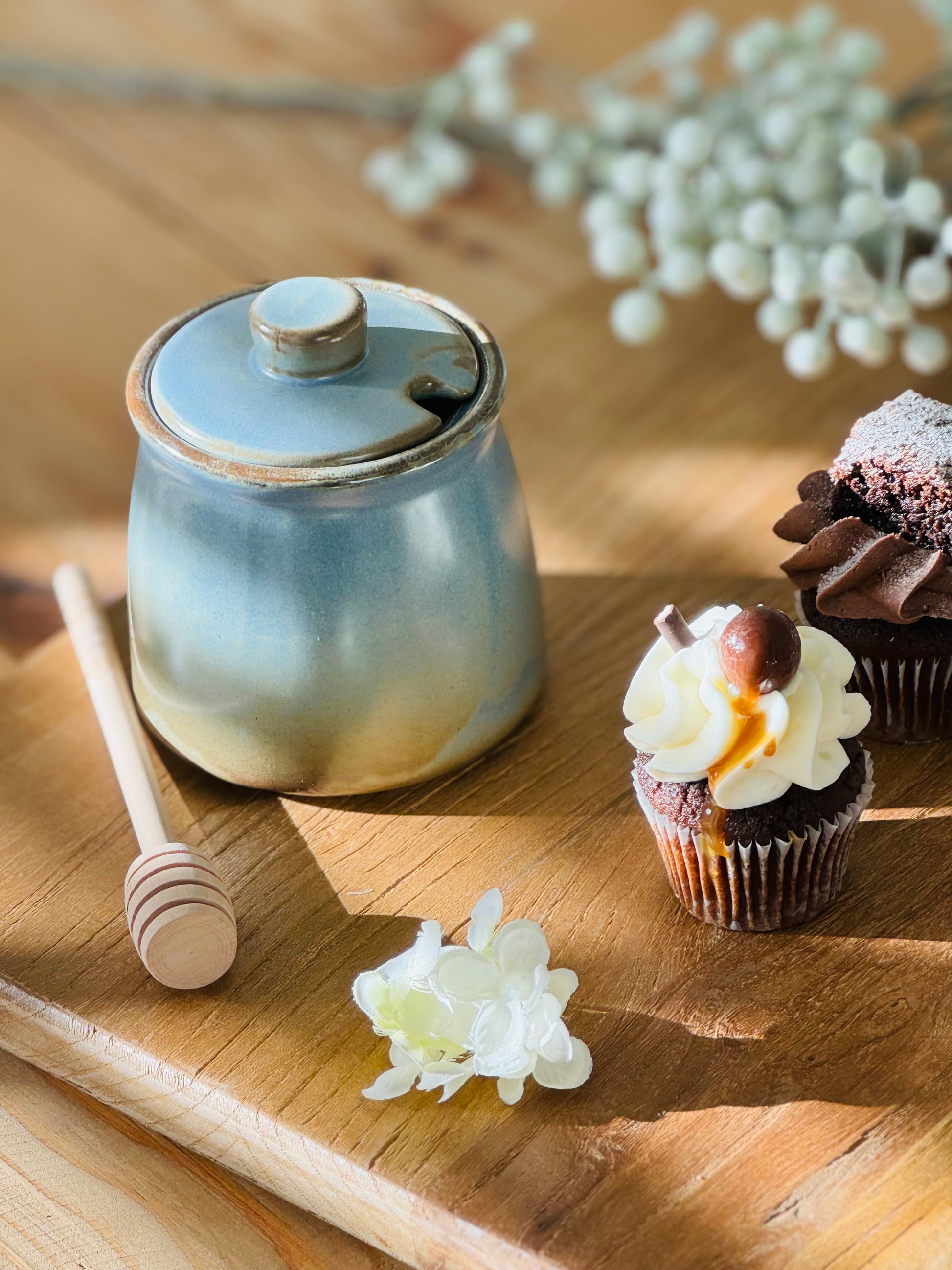The honey pot comes with birch dipper allowing for easy and mess-free pouring.